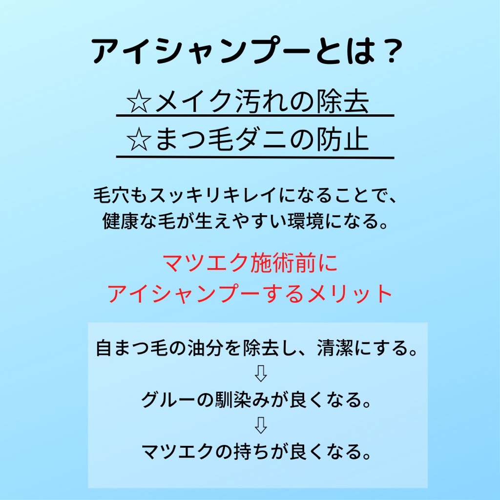 マツエクする前にアイシャンプーすると、まつ毛に付着している油分が取れるのど、マツエクの持ちがアップしますよ。